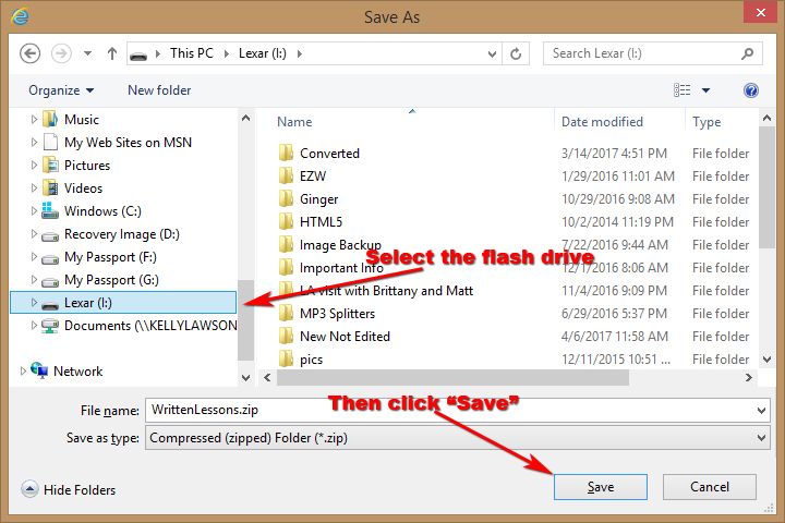 Depending on how your browser is configured, the WrittenLessons zip file will probably be copied to your "Downloads" folder. If not, you will be asked where you want the file saved to. This is the best situation, because it will allow you to download the file directly to your flash drive, or wherever you want to store it. If you are not asked where to store the file, click here for instructions on finding your Downloads folder.